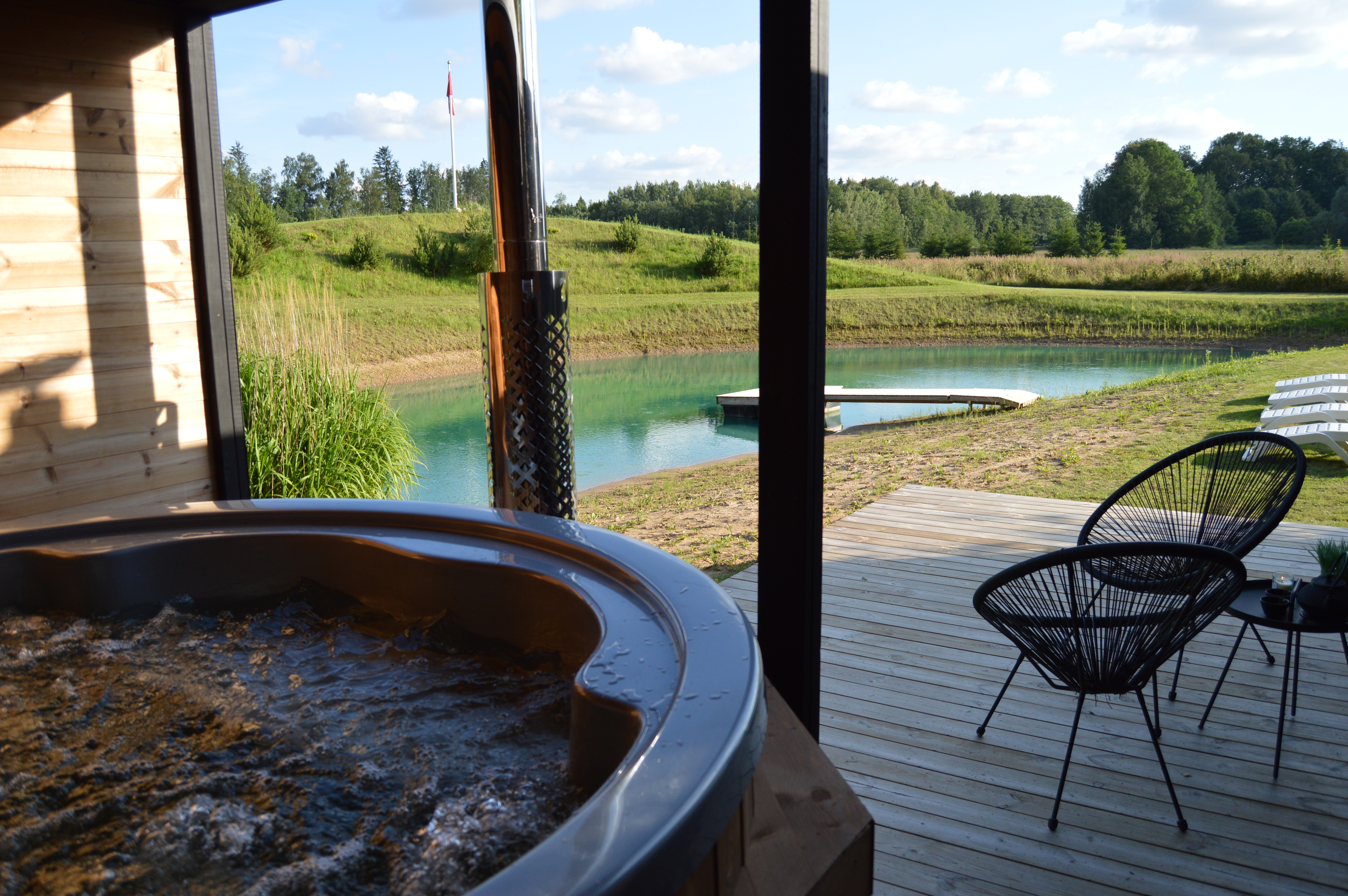 Atskira, privati (su niekuo nesidalinama) mini spa erdvė su gražiu vaizdu į prūdą, kalvą, mišką. Kas gali būti geriau už masažinį karštą kubilą po stogu, šalia esančią sauną su priepirčiu bei lauko terasą atsivėsinimui?